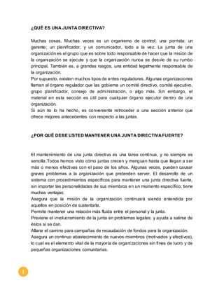 Este documento discute el rol y responsabilidades de una junta directiva y ofrece recomendaciones para mantener una junta efectiva. Explica que la junta es responsable de asegurar que la misión de la organización se cumpla. También recomienda clarificar las funciones de los miembros, mantener reuniones efectivas, definir términos de membresía y asegurar diversidad en la junta.
