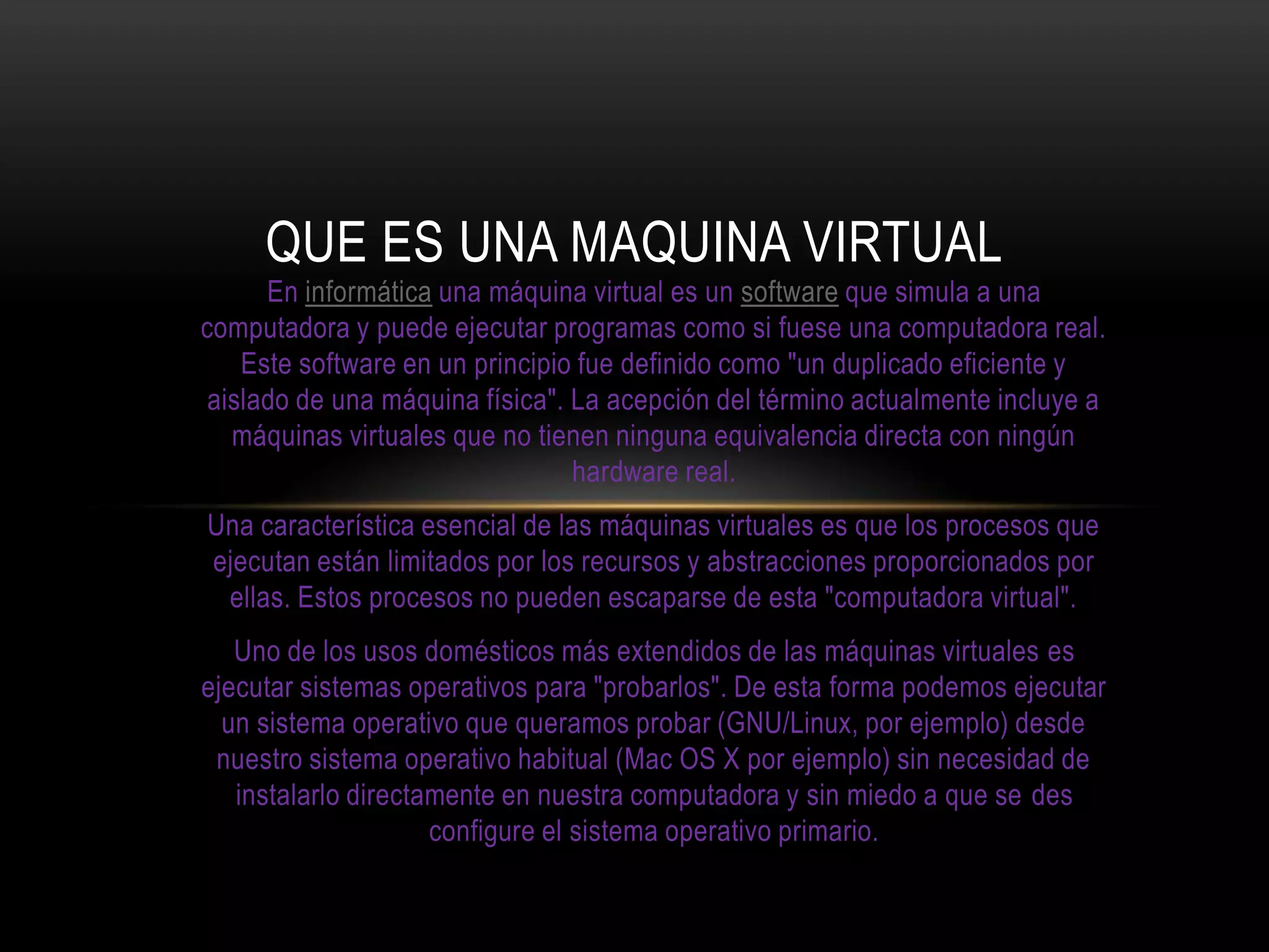 Una máquina virtual es un software que simula una computadora, permitiendo ejecutar programas como si se estuviera en una computadora real. Las máquinas virtuales limitan los procesos a los recursos provistos y evitan que escapen de la "computadora virtual". Un uso común es ejecutar sistemas operativos de forma aislada para probarlos sin instalarlos en la computadora anfitrión.