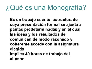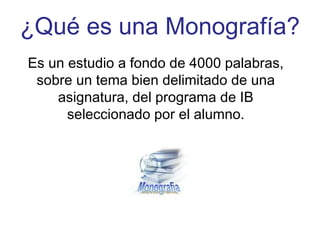La monografía es un trabajo escrito de investigación de aproximadamente 4000 palabras sobre un tema específico de una asignatura del Programa del Diploma. Implica 40 horas de trabajo para el estudiante. Los objetivos son demostrar habilidades de investigación y comunicación, así como desarrollar el pensamiento crítico. La monografía debe seguir un formato formal con secciones como introducción, desarrollo, conclusión y referencias. Se evalúa en base a criterios como la formulación del problema de investigación, el análisis, el argumento y el uso apropiado del