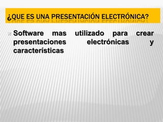 Este documento describe las presentaciones electrónicas y el software más utilizado para crearlas. Define una presentación electrónica como un producto informático donde se pueden insertar textos, imágenes, gráficos y elementos multimedia. Explica que Microsoft PowerPoint es el software más utilizado, seguido de Impress de OpenOffice y Magic Point de Gnome Office. Compara las características de estos programas y menciona algunas ventajas y desventajas de usar presentaciones electrónicas.