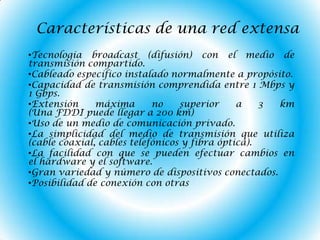 Una red extensa (WAN) amplía el alcance de una red de área local (LAN) para conectar sitios distantes utilizando tecnologías como redes telefónicas y servicios de alta velocidad. Una WAN interconecta LANs a través de enlaces de larga distancia para compartir recursos entre ubicaciones.