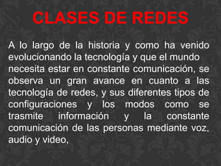 Este documento describe diferentes tipos de redes de computadoras. Una red conecta equipos informáticos y software para compartir información y recursos. Las redes locales (LAN) conectan computadoras en un área pequeña como una habitación o edificio. Las redes metropolitanas (MAN) conectan varias LAN a través de una ciudad. Las redes amplias (WAN) se extienden a través de países o continentes utilizando líneas de transmisión y conmutadores para enviar mensajes entre hosts.