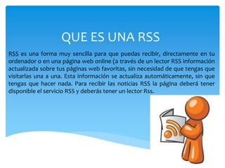 El documento explica el funcionamiento y la utilidad de RSS (Really Simple Syndication) como una herramienta para recibir actualizaciones automáticas de contenido de sitios web sin necesidad de visitarlos individualmente. Se describen diferentes tipos de lectores RSS, incluyendo programas instalados en ordenadores y servicios online, que permiten a los usuarios suscribirse a fuentes RSS y acceder a nueva información de manera sencilla. Esta tecnología facilita la gestión y publicación de noticias e información en línea.