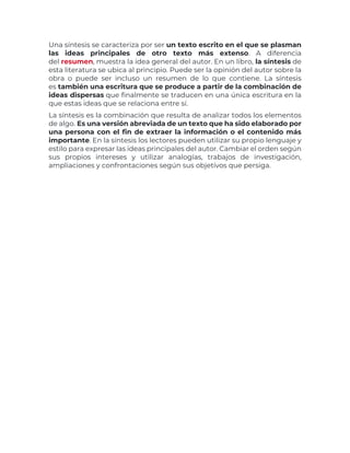 Este documento explica la diferencia entre una síntesis y un resumen, y proporciona consejos para escribir una síntesis. Una síntesis combina ideas principales de un texto más largo en un nuevo texto más breve, mientras que mantiene la esencia del original y puede incluir las interpretaciones del autor. Una buena síntesis sigue una estructura de introducción, desarrollo y conclusión, y usa oraciones cortas y sencillas para expresar las ideas clave de manera interrelacionada. El documento también ofrece consejos como leer el
