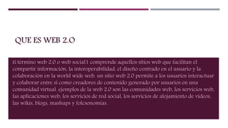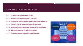 La Web 2.0 permite a los usuarios interactuar y colaborar como creadores de contenido en comunidades virtuales a través de sitios como redes sociales, wikis y blogs. La Web 3.0 evolucionará hacia una red de datos accesible por múltiples aplicaciones con el uso de inteligencia artificial y semántica web. Las principales diferencias son que la Web 2.0 tiene al usuario humano como protagonista mientras que la Web 3.0 involucrará más la inteligencia artificial.