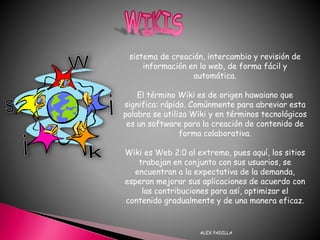 El documento habla sobre Wikis. Explica que un Wiki es un software para crear contenido de forma colaborativa que permite a varios usuarios crear páginas web sobre un mismo tema de manera rápida y eficaz. Cada usuario aporta información para hacer la página más completa creando una comunidad que comparte conocimiento sobre un tema.