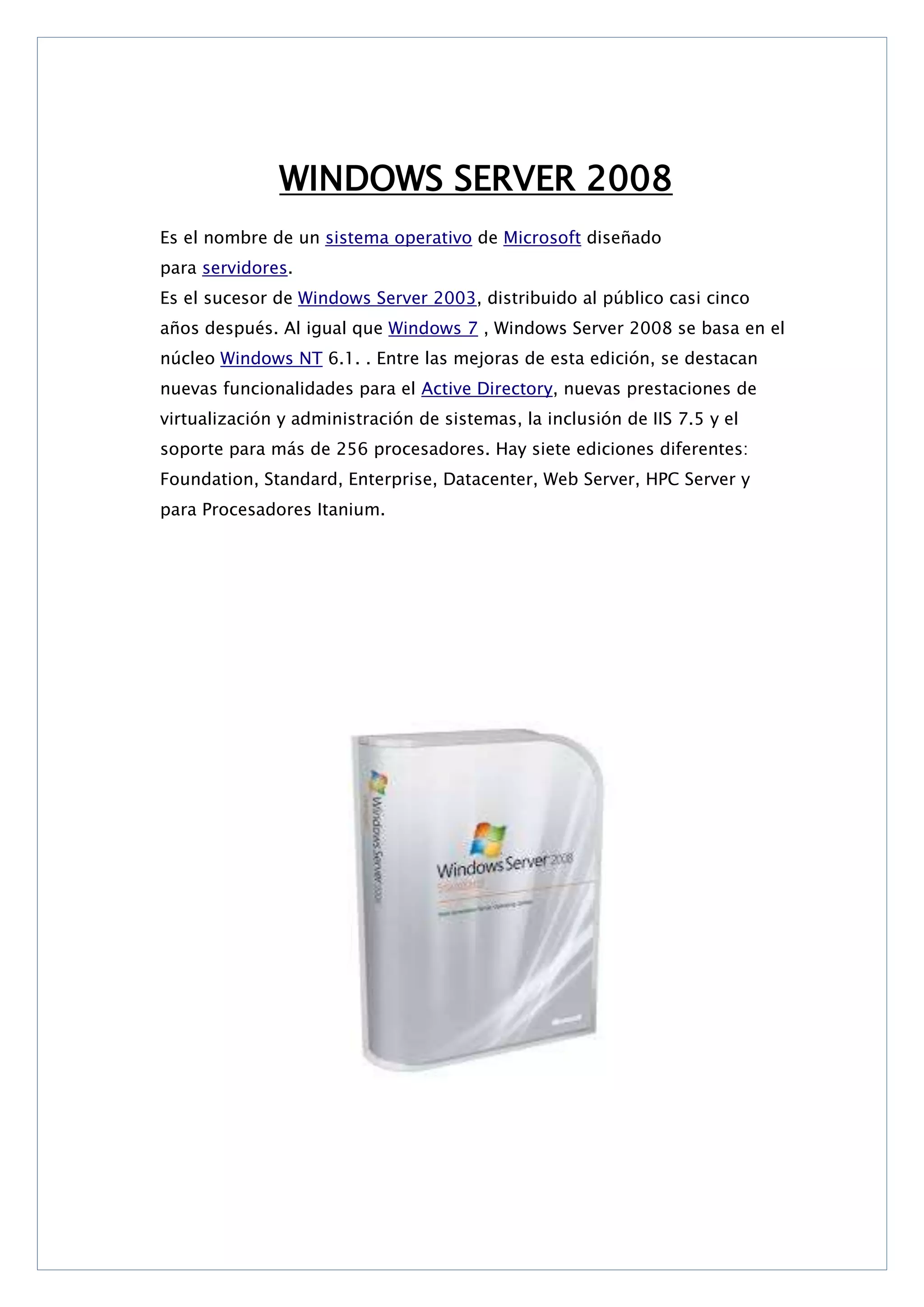 Este documento describe Windows Server 2008 y Linux. Detalla las características y ediciones de Windows Server 2008 como Standard, Enterprise y Datacenter. También cubre Windows Server 2008 R2, incluyendo mejoras en virtualización, Active Directory y seguridad. Además, resume las distribuciones Linux, su historia y algunas de las primeras como Slackware y Debian.