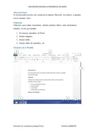 Este documento proporciona instrucciones sobre el uso de Microsoft Word y Gmail. Explica cómo insertar tablas, imágenes, encabezados, pies de página y tablas de contenido en Word. También describe los elementos clave de la interfaz de Gmail como la bandeja de entrada, barra de búsqueda y opciones de contacto. Por último, incluye capturas de pantalla como ejemplos.
