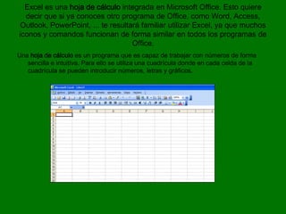 Excel es una hoja de cálculo que permite realizar cálculos y simulaciones de forma sencilla. Permite introducir números, texto y fórmulas en celdas organizadas en filas y columnas. Al modificar los datos, Excel actualiza automáticamente los cálculos. Excel también puede almacenar datos e información en hojas y libros de trabajo.
