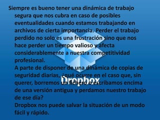 Dropbox es un servicio de almacenamiento y sincronización en la nube que permite a los usuarios almacenar, sincronizar y compartir archivos entre dispositivos de forma gratuita o paga. Ofrece copias de seguridad y recuperación de versiones anteriores de archivos para evitar la pérdida de trabajo. Los usuarios pueden acceder y compartir archivos de forma fácil desde cualquier lugar a través de la aplicación multiplataforma de Dropbox.