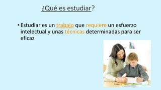 Estudiar es un trabajo que requiere esfuerzo intelectual y técnicas específicas, y su éxito depende de poseer las capacidades mínimas, una motivación adecuada y los hábitos de estudio adecuados. Una buena organización y metodología en el estudio puede llevar a resultados inmediatos como la mejora de notas y a largo plazo a ser un buen profesional. Este documento propone modificar malas técnicas y hábitos para optimizar el aprendizaje con el mínimo esfuerzo.