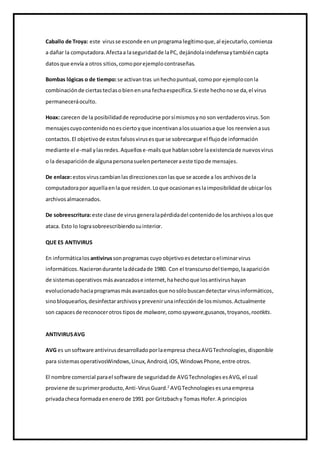 Un virus informático es un malware que se propaga sin el permiso del usuario y altera el funcionamiento del ordenador. Existen diferentes tipos de virus como gusanos, caballos de Troya y bombas lógicas. Los antivirus son programas que detectan y eliminan virus, y han evolucionado para bloquear una variedad de malware adicional. AVG es un popular software antivirus desarrollado por la empresa checa AVG Technologies, disponible para múltiples sistemas operativos y en versiones gratuitas y de pago.
