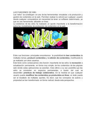 El documento describe las funciones y ventajas de los wikis. Los wikis permiten que múltiples usuarios creen y editen contenido de forma colaborativa. Ofrecen flexibilidad para crear páginas instantáneamente sin preocuparse por el diseño. También mantienen un historial de cambios que permite recuperar versiones anteriores. Gracias a esto, los wikis se han convertido en un popular formato que se beneficia de las contribuciones de la comunidad.