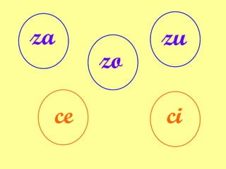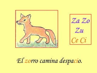 El documento contiene una serie de oraciones cortas sobre varios objetos y actividades que comienzan con las letras "za", "zo", "zu", "ce", "ci". Describe cosas como una tortuga caminando despacio, estar en silencio en el cine, y el color de una manzana.