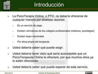 La Psicoterapia Online debe ofrecerse respetando las normativas legales y éticas. Como paciente se puede exigir que el terapeuta cumpla con los requisitos mínimos de calidad tecnológica, seguridad de datos y acreditación profesional, y que informe sobre las medidas tomadas para ello. También se recomienda que el paciente cuente con un equipamiento y entorno adecuados para las sesiones virtuales.