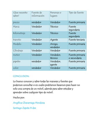 El documento lista diferentes aspectos que una persona necesita saber sobre un vehículo de motor, como el precio, marca, kilómetros, modelo, cilindraje, motor, papeles y color. También identifica posibles fuentes de información para cada aspecto, como vendedores, técnicos, agentes o amigos, y clasifica las fuentes como primarias, secundarias o terciarias. La conclusión señala que es útil conocer diferentes fuentes para obtener información sobre un vehículo antes de una compra.