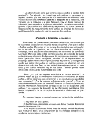 El documento define la estadística y explica sus dos significados principales. La estadística se refiere a información numérica como promedios y porcentajes. También se refiere a la ciencia de reunir, organizar, presentar, analizar e interpretar datos para tomar mejores decisiones. La estadística incluye la estadística descriptiva, que resume y presenta datos, y la estadística inferencial, que determina conclusiones sobre una población basadas en una muestra.