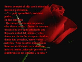 El hijo de un padre adinerado pasó unos días viviendo con una familia campesina para experimentar la pobreza. Al regresar, el hijo le explicó a su padre las lecciones aprendidas: que a pesar de carecer de muchas cosas materiales, la familia campesina vivía conectada a la naturaleza, protegida por la comunidad y apreciando lo esencial de la vida. El hijo concluyó que a pesar de sus privilegios materiales, él y su padre eran más pobres espiritualmente por estar demasiado