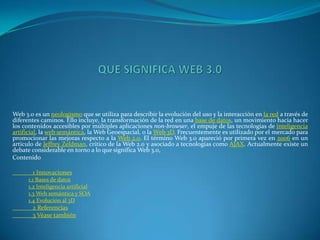 Web 3.0 se refiere a la evolución futura de Internet hacia una red de datos más inteligente e interoperable. Esta evolución incluirá el uso más generalizado de bases de datos, inteligencia artificial, web semántica y contenido 3D. Aunque no existe consenso sobre una definición precisa, Web 3.0 apuntará a hacer que los datos y contenidos sean más accesibles e interoperables entre diferentes aplicaciones y dispositivos.