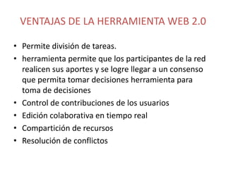 El documento define la Web 2.0 como sitios web que facilitan el compartir información, la interoperabilidad y la colaboración entre usuarios para crear contenido, a diferencia de sitios estáticos. Ejemplos incluyen comunidades web, redes sociales, blogs y wikis. Aunque el término sugiere una nueva versión de la web, realmente se refiere a cambios en cómo desarrolladores y usuarios usan la web de forma interactiva y colaborativa.