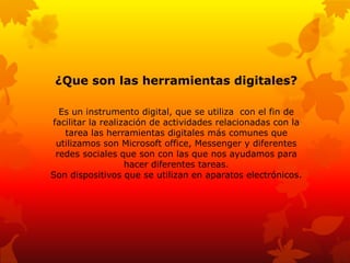Las herramientas digitales son instrumentos digitales como Microsoft Office y redes sociales que facilitan la realización de tareas. Son importantes para la educación porque permiten a los estudiantes interactuar con la tecnología, comunicarse y acceder a recursos educativos. Las herramientas digitales se pueden usar como objeto de aprendizaje, medio de aprendizaje o apoyo al aprendizaje.