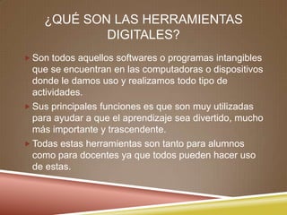 Este documento describe las herramientas digitales y las competencias digitales que se espera que tengan los docentes del siglo XXI. Define las herramientas digitales como programas que se usan en computadoras y dispositivos para realizar actividades. Luego clasifica varias herramientas digitales y enumera numerosas competencias digitales para docentes, como crear audio y video digital, usar blogs y wikis, aprovechar imágenes y redes sociales, y conocer sobre seguridad en internet y derechos de autor.