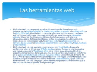 El documento describe las herramientas de la Web 2.0, que permiten a los usuarios interactuar y crear contenido en comunidades virtuales, a diferencia de sitios web estáticos. Ejemplos incluyen blogs, wikis, redes sociales y servicios de video. La Web 2.0 se refiere a cambios en cómo los desarrolladores y usuarios usan la web, no a actualizaciones técnicas. El documento también describe las ventajas, como acceso fácil, ahorro de tiempo y costos, expansión de mercados, y capacidad de segment