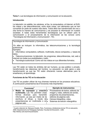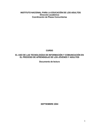 Este documento describe el uso de las tecnologías de información y comunicación (TIC) en el aprendizaje de adultos y jóvenes. Explica las funciones de las TIC en la educación, como medio de expresión, comunicación, procesamiento de información y fuente de información. También analiza las ventajas de las TIC, como la motivación y la programación flexible del aprendizaje, así como las desventajas, tales como las distracciones y la dispersión. Finalmente, enfatiza la importancia de planificar adecuadamente el uso de las T