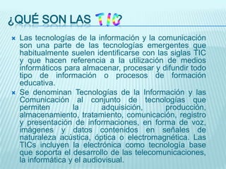 Las TIC son tecnologías como la computadora, internet y la telefonía móvil que permiten almacenar, procesar y compartir información. Algunas ventajas de las TIC incluyen el acceso a la educación y salud a distancia, apoyo a emprendedores y nuevas formas de trabajo como el teletrabajo.