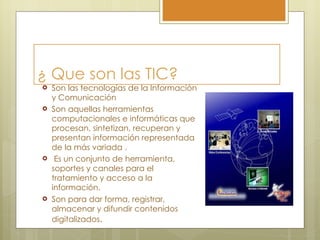 Las TIC son las tecnologías de la información y comunicación, que procesan, sintetizan, recuperan y presentan información de forma digital. Estas herramientas computacionales e informáticas incluyen computadoras, televisión y otros artículos tecnológicos que se usan en el hogar y la educación. El uso de las TIC ha cambiado nuestra forma de vida e impactado áreas como la educación, donde han demostrado ser útiles para docentes y estudiantes.