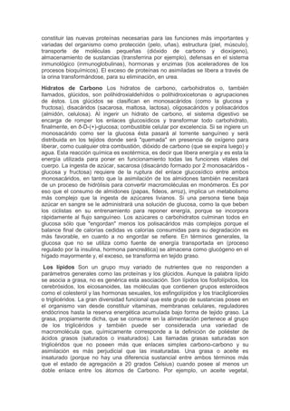 Los alimentos contienen principios nutritivos como proteínas, hidratos de carbono, grasas, vitaminas, sales minerales y agua. Estas sustancias se incorporan al cuerpo para obtener energía, formar y reparar tejidos, y regular funciones. Las proteínas se forman por la unión de aminoácidos y cumplen funciones estructurales, de transporte y defensa en el cuerpo. Los hidratos de carbono incluyen azúcares, almidones y fibras y proporcionan la principal fuente de energía. Las grasas