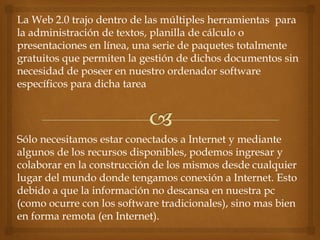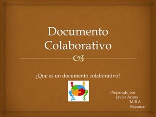 Un documento colaborativo es un documento que permite que múltiples usuarios trabajen en él simultáneamente desde cualquier lugar a través de Internet. Los documentos colaborativos se almacenan en línea para que cualquier persona con acceso a Internet pueda editarlos o contribuir sin importar el software que usen. Estos documentos permiten iniciar un proyecto desde cero o continuar trabajando en uno existente de forma compatible entre todos los usuarios.