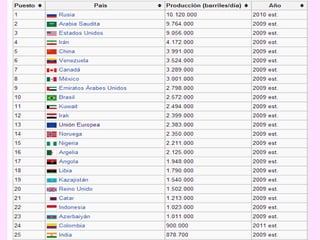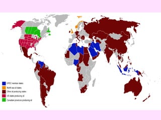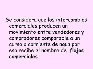 El documento habla sobre los flujos comerciales, que son los intercambios entre vendedores y compradores comparables a un río. Estos flujos no solo incluyen mercancías, sino también materias primas y productos manufacturados. El petróleo es la materia prima fundamental en el comercio mundial actual debido a su importancia para la industria. La OPEP es la organización que agrupa a la mayoría de los países productores de petróleo y se encarga de regular los niveles de extracción y el precio mundial. Los bloques comerciales se