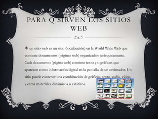 Un sitio web es un conjunto de páginas web relacionadas alojadas en un dominio de Internet. Cada página web es un documento HTML/XHTML accesible a través del protocolo HTTP. Los sitios web permiten publicar información como texto, gráficos, audio y video de manera organizada. Se pueden crear sitios web de forma sencilla usando diseños predeterminados sin necesidad de programación.