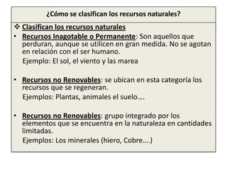 Este documento define y clasifica los recursos naturales. Se definen como bienes materiales y servicios proporcionados por la naturaleza sin alteración humana que son valiosos para las sociedades. Se clasifican en recursos renovables como el sol, viento y mareas; no renovables como plantas y animales; y no renovables como los minerales. También describe los recursos marinos, hidráulicos y minerales.