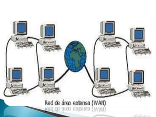 Una LAN (Red de área local) conecta equipos dentro de una pequeña área geográfica, generalmente usando Ethernet. Una LAN puede contener hasta 1000 usuarios y ofrece velocidades de hasta 1 Gbps. En una red P2P la comunicación es directa entre equipos, mientras que en una red cliente-servidor un equipo central brinda servicios a los clientes. Una WAN (Red de área amplia) conecta LANs a largas distancias, incluso a nivel mundial, mientras que una MAN (Red de área metropolitana) cone