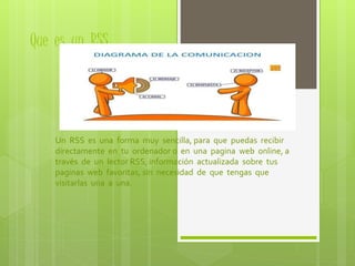 Un RSS es una forma de recibir actualizaciones de sitios web favoritos de forma automática a través de un lector RSS sin necesidad de visitar cada sitio individualmente. Un lector RSS revisa los feeds RSS de los sitios suscritos y descarga nuevos contenidos de manera automática. Los usuarios pueden suscribirse a los feeds RSS de sitios mediante lectores RSS instalados localmente, lectores RSS en línea o a través de funcionalidades RSS en navegadores y clientes de correo electrónico.