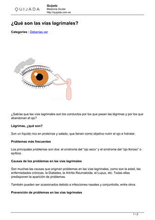 Las vías lagrimales son los conductos por los que pasan las lágrimas desde el ojo hasta la nariz. Los principales problemas de las vías lagrimales son el síndrome del ojo seco y el síndrome del ojo lloroso. Las causas de problemas en las vías lagrimales incluyen la edad, enfermedades crónicas como la diabetes y la artritis reumatoide, e infecciones nasales y conjuntivitis. Los tratamientos para problemas de las vías lagrimales van desde gotas artificiales para la sequedad leve hasta cirugía
