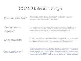 El documento presenta estrategias de ventas en diseño de interiores, enfocándose en la calidad, el servicio al cliente y la comprensión de las necesidades del cliente. Se detallan los tipos de clientes y sus características, así como los pasos del proceso de venta y recomendaciones para facilitar la toma de decisiones. Además, se proponen métodos de posicionamiento y promoción, incluyendo el uso de espacios de co-working y el desarrollo de una aplicación para mejorar la experiencia del cliente.