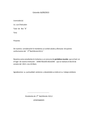 Los estudiantes del segundo bachillerato B.G.U invitan a los tutores de varios grados de la institución "Jaime Roldós Aguilera" a un concurso de periódicos murales que se llevará a cabo el 2 de octubre de 2013 a las 10:30 am.