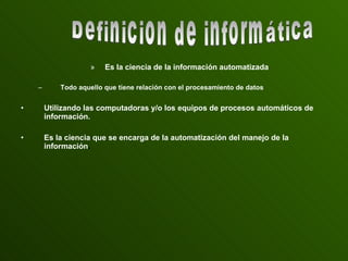 Este documento resume la historia de la informática desde el siglo XVII hasta la actualidad. Comenzó con las primeras calculadoras mecánicas inventadas por Pascal y Leibniz. En 1946 se creó el primer ordenador electrónico digital de propósito general, mientras que en 1944 se había creado el primer ordenador electrónico para un uso específico. En 1975 se lanzó el Altair 8800, el primer computador personal reconocible. Actualmente, la supercomputación permite la innovación continua de las tecnologías de la información.