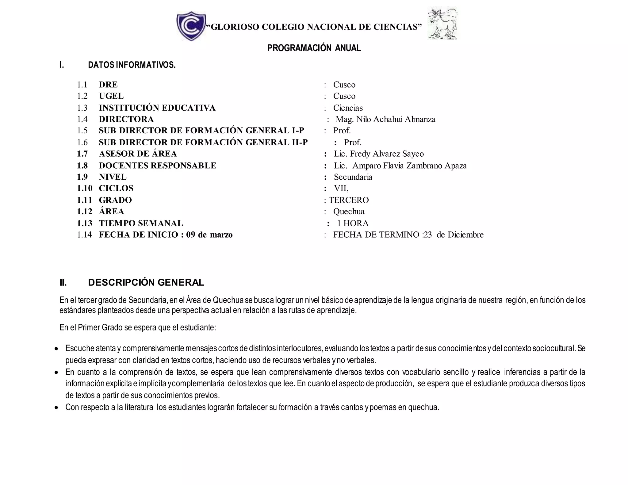 El documento presenta la programación anual del área de Quechua del tercer grado de secundaria del Colegio Nacional de Ciencias. La programación contiene tres unidades didácticas que abordan diversos temas culturales y lingüísticos relacionados con el quechua. La primera unidad analiza el origen y costumbres de la Semana Santa en la región. La segunda trata sobre la festividad patronal del colegio. Y la tercera examina las celebraciones navideñas y su diversidad cultural. Cada unidad incluye competencias, campos temá