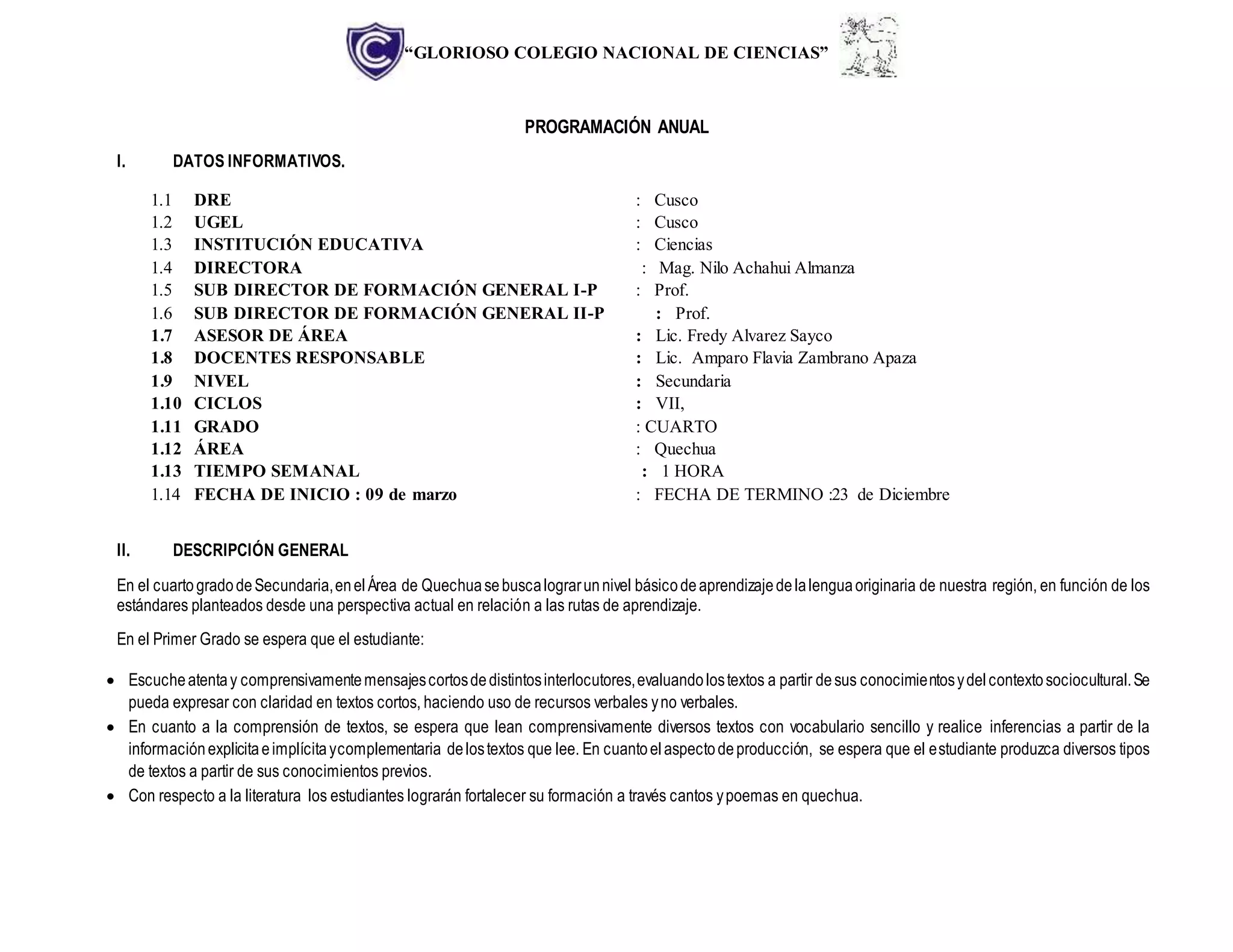El documento presenta la programación anual del área de Quechua del cuarto grado de secundaria del Colegio Nacional de Ciencias de Cusco. La programación contiene tres unidades didácticas que abordan diversos temas culturales y lingüísticos. La primera unidad analiza el origen y costumbres de la Semana Santa en la región. La segunda trata sobre la festividad patronal del colegio. Y la tercera examina las celebraciones navideñas y su diversidad cultural. Cada unidad incluye competencias, campos temáticos