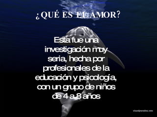 El documento presenta las respuestas de niños de entre 4 y 8 años sobre qué es el amor. Algunas de sus definiciones incluyen que el amor es cuidar a otros aunque estén enojados, ayudar a los demás aunque duela, y continuar amando a alguien a pesar de sus defectos o problemas.