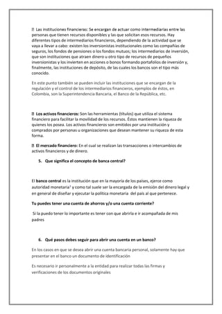 El documento describe lo que es un banco, los servicios que presta como cuidar el dinero de los ahorradores, cuentas de ahorro, créditos, entre otros. Explica los tipos de bancos según su origen como públicos, privados o mixtos, y según su operación como bancos corrientes, especializados, centrales o de segundo piso. Finalmente, resume los elementos principales del sistema financiero como los intermediarios, activos financieros y el mercado financiero.