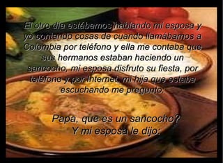 El documento describe lo que significa un sancocho para los colombianos. Un sancocho representa más que una sopa, simboliza amistad, amor, familia y tradiciones colombianas. Explica a su hija que un sancocho es un icono cultural que identifica a Colombia y lo que es ser colombiano.