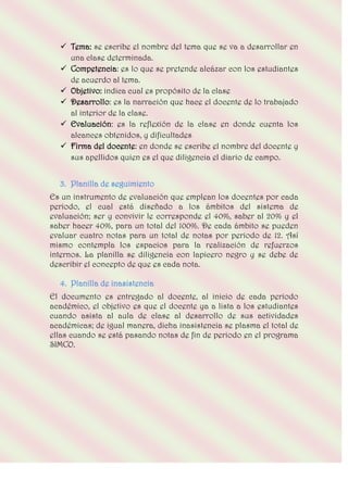 Este documento describe los principales instrumentos pedagógicos utilizados en las instituciones educativas, incluyendo el planeador de clase, el diario de campo, la planilla de seguimiento y la planilla de inasistencia. El planeador de clase guía al docente en el aula y describe el tema, objetivo y actividades de la clase. El diario de campo es donde el docente registra la lección impartida y su reflexión. La planilla de seguimiento es para la evaluación por periodo de los estudiantes en áreas como ser, saber y saber hacer.
