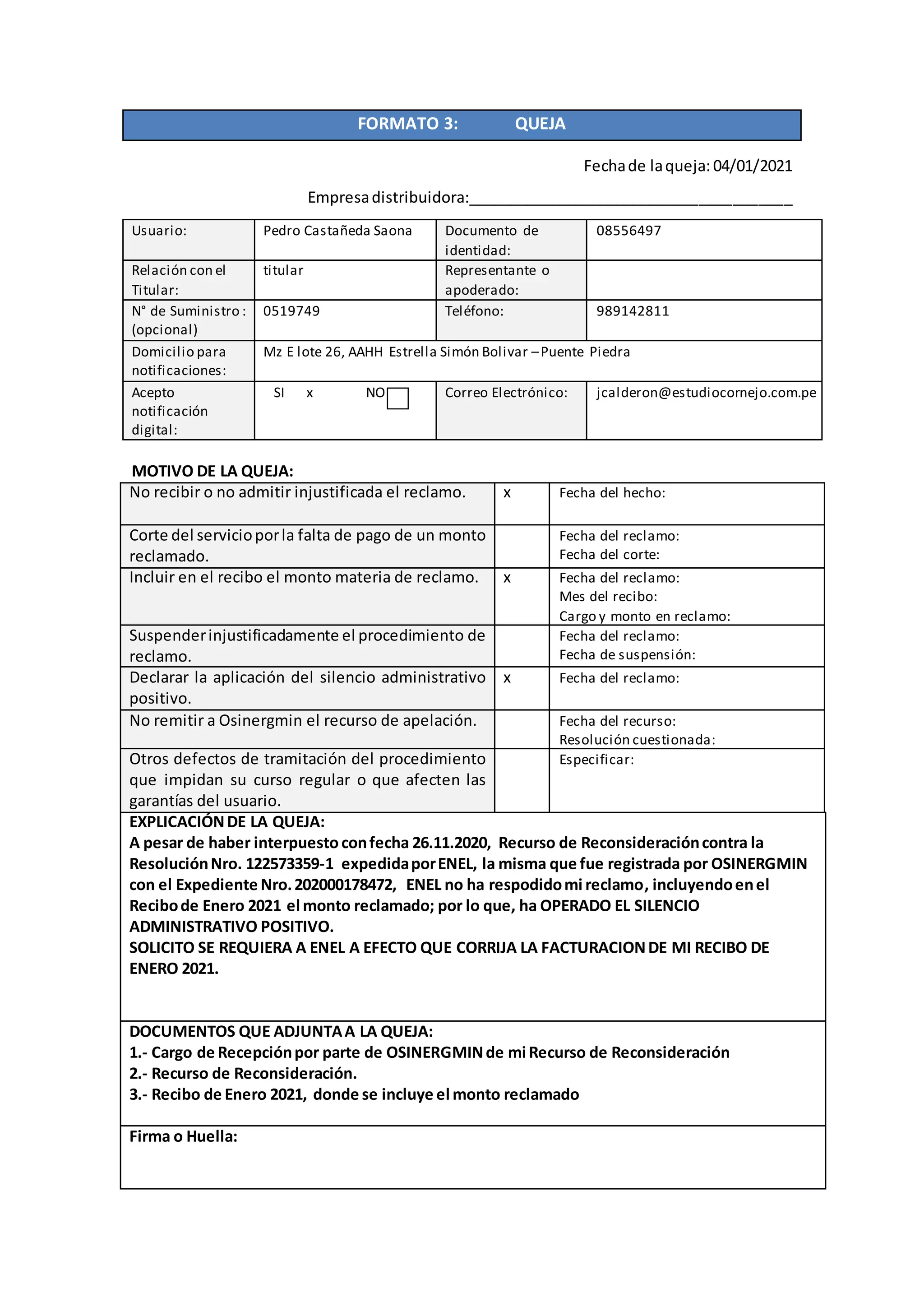 Pedro Castañeda presenta una queja contra la empresa distribuidora ENEL por haber declarado el silencio administrativo positivo en su reclamo. Presentó un recurso de reconsideración el 26 de noviembre de 2020 ante ENEL por la Resolución N° 122573359-1, la cual fue registrada por OSINERGMIN con el Expediente N° 202000178472. Sin embargo, ENEL no ha respondido su reclamo e incluyó el monto cuestionado en su recibo de enero de 2021. Pedro solicita que se requiera a ENEL corregir la fact
