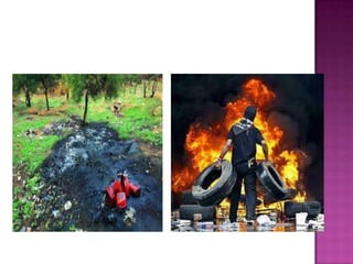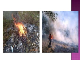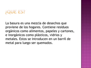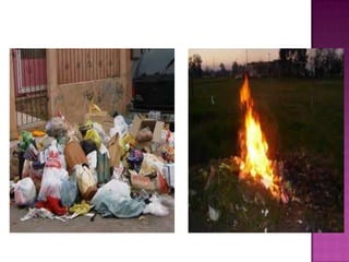 Este documento discute los peligros de quemar basura al aire libre. Quemar basura libera sustancias químicas dañinas y partículas en el aire que pueden causar enfermedades respiratorias y contaminar el agua. Además, cuando la basura se quema cerca del suelo, los contaminantes no se dispersan fácilmente y pueden afectar a las personas que viven cerca. Es mejor llevar la basura a lugares especializados para su tratamiento y reducir el daño ambiental.