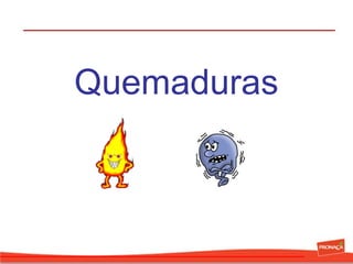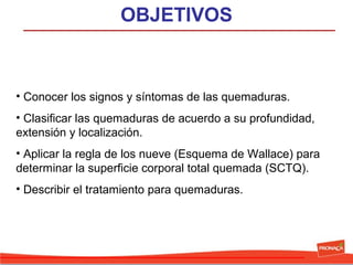 Este documento clasifica y describe los tipos de quemaduras, sus causas, signos y síntomas, y tratamiento prehospitalario. Las quemaduras se clasifican por profundidad, extensión y localización, y la regla de los nueve se usa para determinar la superficie corporal quemada total. El tratamiento prehospitalario incluye enfriar la zona quemada, evaluar la vía aérea, hidratación, cubrir la herida y transporte al hospital. Quemaduras eléctricas y químicas requieren precauciones adicionales
